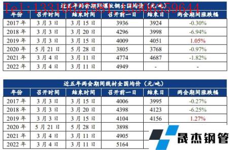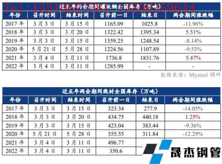 3月4日和5日,全國(guó)政協(xié)十三屆五次會(huì)議和十三屆全國(guó)人大五次會(huì)議先后在北京開(kāi)幕。整理了過(guò)去五年兩會(huì)期間建筑厚壁無(wú)縫鋼管價(jià)格和庫(kù)存的數(shù)據(jù)變化。