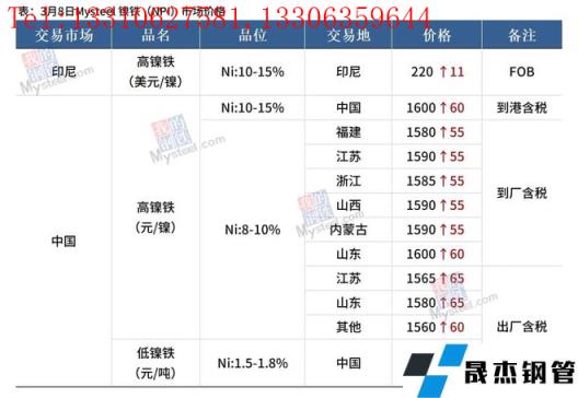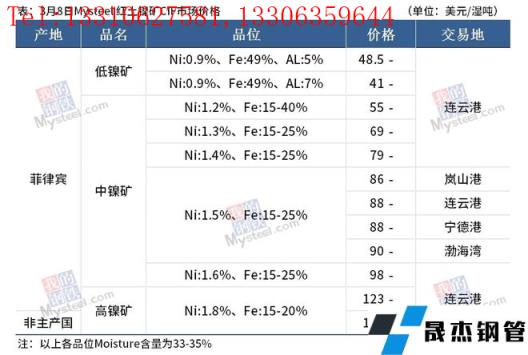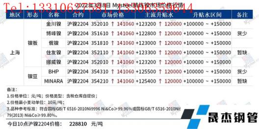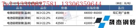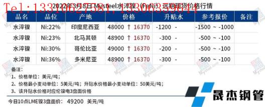 免責(zé)聲明:本網(wǎng)站(山東聊城晟杰無縫鋼管廠www.frdimp.com)刊載的“鎳產(chǎn)業(yè)鏈價格(2022.3.8)”等均源于網(wǎng)絡(luò),版權(quán)歸原作者所有,且僅代表原作者觀點,本文所載信息僅供參考。轉(zhuǎn)載僅為學(xué)習(xí)與交流之目的,如無意中侵犯您的合法權(quán)益,請及時聯(lián)系刪除。本網(wǎng)站刊登此篇文章并不意味著本站贊同其觀點或證實其內(nèi)容的真實性,我們不對其科學(xué)性、嚴(yán)肅性等作任何形式的保證。如果侵犯了您的版權(quán),請盡快聯(lián)系我們予以撤銷,謝謝合作!