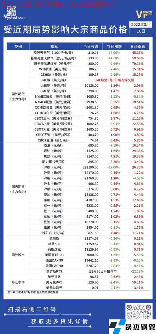 近期,受國(guó)際局勢(shì)影響,全球金融及大宗商品市場(chǎng)出現(xiàn)較大波動(dòng)。3月10日,國(guó)際能源價(jià)格繼續(xù)大幅回落,滬鎳主力合約恢復(fù)交易后跌停。匯總情況如下: