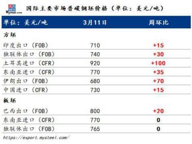 本周東南亞資源報(bào)價(jià)持續(xù)上漲。本周越南報(bào)價(jià)達(dá)到800美元/噸FOB,較上周大幅上漲85美元/噸。據(jù)了解,越南目前出口訂單充足,4月貨物已經(jīng)全部被訂購,目前報(bào)價(jià)貨物為5月發(fā)出。目前越南方坯主要買家為菲律賓,本周早些時(shí)候,菲律賓以780美元/噸FOB價(jià)格采購越南高爐方坯,隨后越南報(bào)價(jià)上漲。