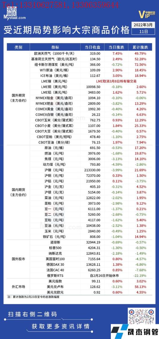 近期,受國際局勢影響,全球金融及大宗商品市場出現(xiàn)較大波動(dòng)。3月11日,商品及金融市場漲跌互現(xiàn),波動(dòng)幅度較前期明顯收窄。匯總情況如下: