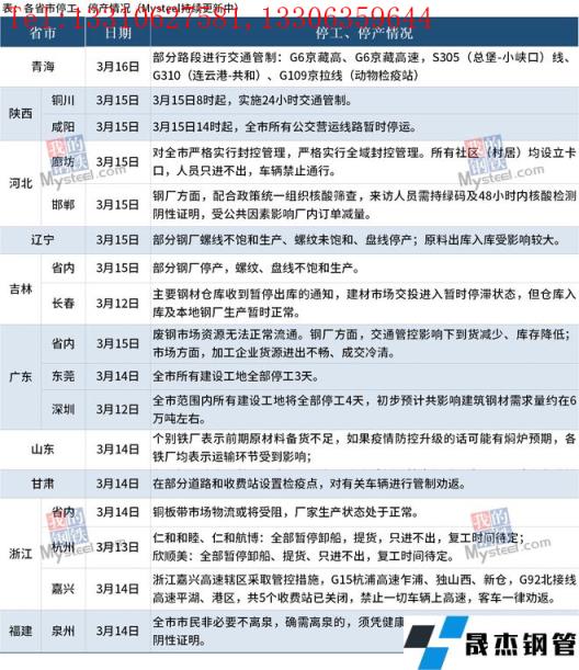 截至3月16日,匯總了10個(gè)省份最新停工停產(chǎn)信息。其中,廣東省3月15日開始,廢鋼市場(chǎng)資源無法正常流通;無縫厚壁鋼管廠家方面,交通管控影響下到貨減少、庫存降低;市場(chǎng)方面,加工企業(yè)貨源進(jìn)出不暢、成交冷清。陜西省銅川市于15日宣布全市范圍內(nèi)實(shí)施24小時(shí)交通管制;咸陽市15日宣布全市所有公交營運(yùn)路線暫時(shí)停運(yùn)。吉林省部分無縫厚壁鋼管廠家停產(chǎn),螺紋、盤線不飽和生產(chǎn)。與此同時(shí),全國其他地區(qū)鋼貿(mào)交易也受到影響,部分工地開始停工,物流運(yùn)輸暫停服務(wù)。具體情況如下: