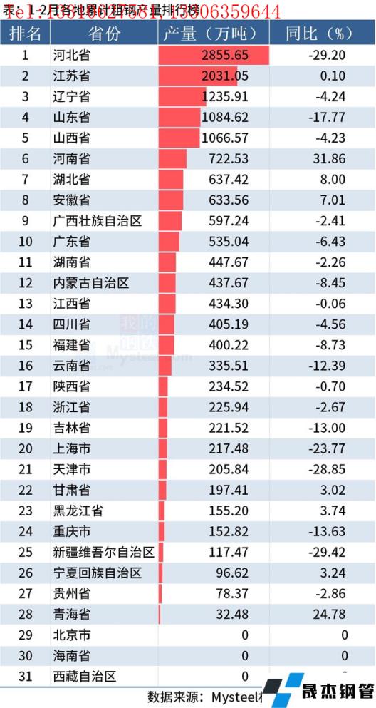 從分省數(shù)據(jù)來看,有4個省份1-2月粗鋼產(chǎn)量同比降幅超過20%。其中河北降29.20%、上海降23.77%,天津降28.85%和新疆降29.42%。具體情況如下: