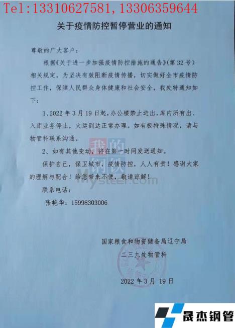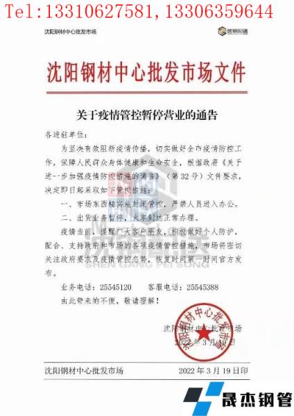 目前沈陽(yáng)厚壁無縫鋼管中心批發(fā)市場(chǎng)已發(fā)布通告,19日起北一西路東西樓試試封閉管控、嚴(yán)禁人員進(jìn)入辦公,出庫(kù)業(yè)務(wù)暫停、火車到達(dá)正常辦理;中國(guó)兵工物資125庫(kù)通告19日起嚴(yán)禁人員進(jìn)入庫(kù)區(qū)辦公,出庫(kù)業(yè)務(wù)暫停、火車到達(dá)正常辦理;國(guó)家糧食和物資儲(chǔ)備局遼寧局二三九處通告19日起辦公樓嚴(yán)禁進(jìn)出,庫(kù)內(nèi)所有出入庫(kù)業(yè)務(wù)暫停、火運(yùn)到達(dá)正常辦理。市內(nèi)其他主要厚壁無縫鋼管市場(chǎng)反饋暫時(shí)正常辦公及出庫(kù),但從防控指揮部通告內(nèi)容來看、也有暫停營(yíng)業(yè)的傾向。(通告見文末圖片)