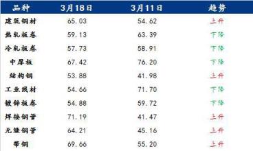具體各品種指數(shù)來(lái)看,3月18日建筑厚壁無(wú)縫鋼管情緒指數(shù)為65.03,較3月11日回升10.41;熱軋板卷情緒指數(shù)為59.13,較3月11日回落4.26;冷軋板卷情緒指數(shù)為57.73,較3月11日回落1.18;中厚板情緒指數(shù)為67.42,較3月11日回落8.78;結(jié)構(gòu)鋼情緒指數(shù)為53.88,較3月11日回升11.9;工業(yè)線材情緒指數(shù)為54.66,較3月11日回落17.04;鍍鋅板卷情緒指數(shù)為54.88,較3月11日回落4.84;焊接厚壁鋼管情緒指數(shù)為71.19,較3月11日回升29.72;無(wú)縫厚壁鋼管情緒指數(shù)為64.21,較3月11日回升19.05;帶鋼情緒指數(shù)為69.66,較3月11日回升14.46。