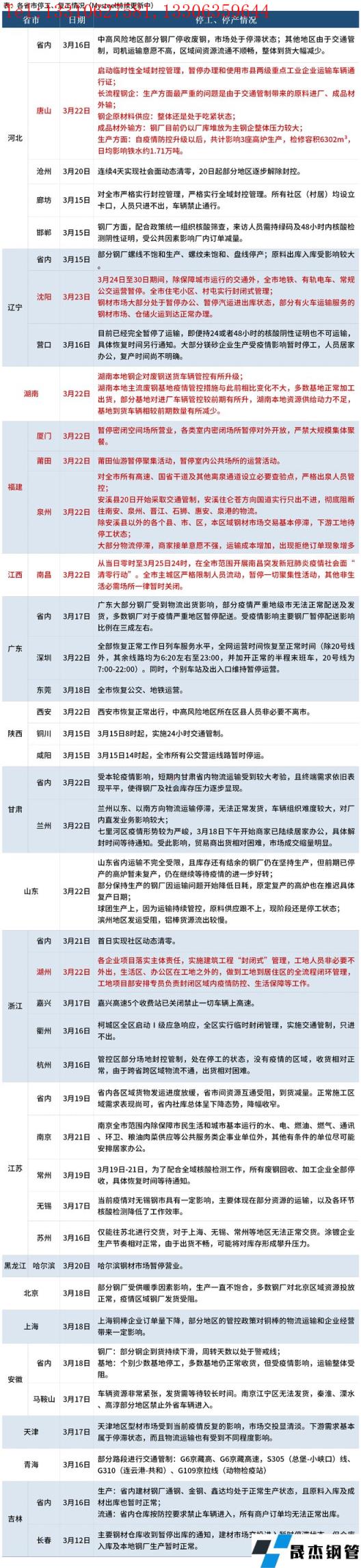 其中,3月22日,唐山市啟動(dòng)臨時(shí)性全域封控管理,暫停辦理和使用市縣兩級(jí)重點(diǎn)工業(yè)企業(yè)運(yùn)輸車輛通行證。沈陽(yáng)于3月24日至30日期間,除保障城市運(yùn)行的交通外,全市地鐵、有軌電車、常規(guī)公交運(yùn)營(yíng)暫停,全市住宅小區(qū)、村屯實(shí)行封閉式管理;厚壁無(wú)縫鋼管市場(chǎng)大部分處于暫停辦公、暫停汽運(yùn)進(jìn)出庫(kù)狀態(tài),部分有火車運(yùn)輸服務(wù)的厚壁無(wú)縫鋼管市場(chǎng)、倉(cāng)儲(chǔ)火運(yùn)到達(dá)正常辦理。3月20日福建泉州安溪縣開(kāi)始采取交通管制,除安溪縣以外的各個(gè)縣、市、區(qū),本區(qū)域厚壁無(wú)縫鋼管市場(chǎng)交易基本停滯,下游工地待停工狀態(tài)。具體情況如下: