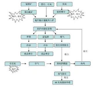 富錳渣生產(chǎn)線整個工藝系統(tǒng)由原材料入廠、儲存、電子稱稱量、皮帶輸送機上料、布料小車布料、高爐還原冶煉、鐵水包,成品入庫及成品發(fā)放等組成。在生產(chǎn)過程中排出大量的高溫含塵煙氣,煙氣主要成份是煤氣,所產(chǎn)生的煙塵是要是爐塵和瓦斯泥。