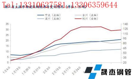 截3月24日,據(jù)我網(wǎng)調研浙江省主流市場包括杭州、寧波、臺州和溫州四大市場的樣本倉庫建筑厚壁無縫鋼管社會庫存總量為172.39萬噸,較上一周增加4.31萬噸,增幅2.56%。具體情況如圖所示。
