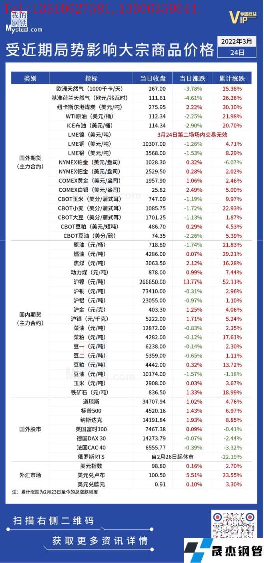 近期,受國際局勢影響,全球金融及大宗商品市場出現(xiàn)較大波動(dòng)。3月24日,國際油價(jià)、能源價(jià)格下跌,倫敦金屬交易所(LME)表示,3月24日鎳的第二場場內(nèi)交易將被視為受到干擾,該交易期間達(dá)成的所有交易將無效。匯總情況如下:
