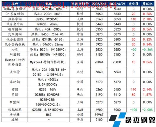 核心觀點(diǎn):上周厚壁無縫鋼管市場(chǎng)整體小幅上漲,五一假期前后,市場(chǎng)存在小幅度的需求放量,疊加節(jié)前現(xiàn)貨成本普遍偏高,因此現(xiàn)貨價(jià)格多數(shù)在節(jié)后小幅上漲;另一方面,市場(chǎng)對(duì)于疫情緩解后的需求釋放情況保持樂觀,因此從預(yù)期方面而言也多以看漲較多;在有色方面,整體下游行業(yè)消費(fèi)不及預(yù)期,銅、鋁上周價(jià)格有所下滑,市場(chǎng)整體呈現(xiàn)較為弱勢(shì)。