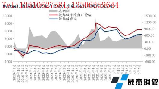 對(duì)民營(yíng)企業(yè)成本&利潤(rùn)測(cè)算數(shù)據(jù)顯示:2022年4月份鍍錫板生產(chǎn)成本7576.51元/噸,月環(huán)比增加48.2元/噸;毛利583.49元/噸,月環(huán)比下降68.2元/噸,同比下滑284.27元/噸,全流程企業(yè)整體利潤(rùn)尚可。4月基板結(jié)算成本增加、疫情影響下,運(yùn)輸成本上漲明顯,錫錠成本窄幅回調(diào),鍍錫板出廠價(jià)格挺價(jià)意愿偏弱。