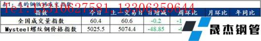 訊:全國建筑厚壁無縫鋼管成交量監(jiān)測,成交量相對指數(shù)來看,全國60.4增0.2,北方41減1.9,華東86.9增0.9,南方45.5減0.3。今日螺紋鋼價格指數(shù)5025.5,較上一交易日減48.85。