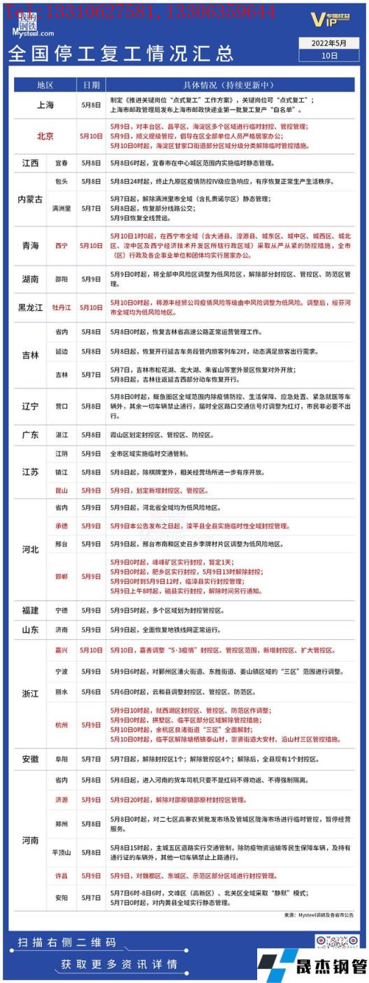 截至5月10日,據(jù)不完全統(tǒng)計(jì),共有17個省份發(fā)布了停工復(fù)工最新信息。5月9日,北京豐臺區(qū)、昌平區(qū)、海淀區(qū)多個區(qū)域進(jìn)行臨時封控、管控管理。邯鄲多區(qū)域?qū)嵭蟹饪毓芾怼?月10日1時起,西寧市全域采取從嚴(yán)從緊的防控措施,全市(區(qū))行政及各企事業(yè)單位和團(tuán)體均實(shí)行居家辦公。具體情況如下: