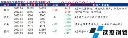4、貴州地區(qū)4月電弧爐無縫厚壁鋼管廠家日均建筑厚壁無縫鋼管產(chǎn)量為8286噸,環(huán)比減少482噸,降幅5.50%;同比減少4000噸,降幅32.56%。4月檢查組進駐貴州,貴州地區(qū)開展安全大檢查,部分電弧爐無縫厚壁鋼管廠家生產(chǎn)受到影響,加之建材價格低洼,廢鋼價格堅挺,無縫厚壁鋼管廠家延續(xù)虧損,停產(chǎn)檢修較多,產(chǎn)量環(huán)比小幅下降。