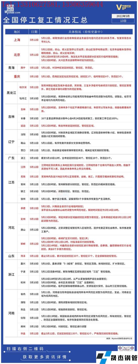 截至5月13日,據(jù)不完全統(tǒng)計(jì),共有13個(gè)省份發(fā)布了停工復(fù)工最新信息。江陰、承德繼續(xù)施行全域封控。北京多區(qū)實(shí)施管控措施。菏澤全部解除封控管控。具體情況如下: