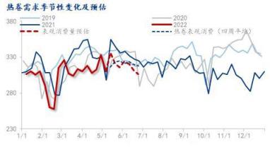 4月下旬開始海外熱卷的緊張程度有所緩解,一方面,西歐對于高價(jià)格的承受能力有限,導(dǎo)致了市場的投機(jī)情緒有所下降;另一方面,俄烏資源也恢復(fù)了一部分出口,使得緊張的情況有所緩解。目前歐洲對于我國的懲罰性關(guān)稅和反補(bǔ)貼稅依然較高,當(dāng)?shù)卦谫徺I時(shí)首選依然不是我國,所以對于剛需而言,西歐并不在我國鋼鐵出口的范圍內(nèi)。從6-7月船期的情況看,環(huán)比下降的情況概率較大,預(yù)計(jì)在-15%~-20%的水平。下降完以后,國內(nèi)外比價(jià)依然存在,所以大致可以判斷,出口量會(huì)有所維持,但高點(diǎn)已現(xiàn),預(yù)期每個(gè)月量在100-120萬噸水平。