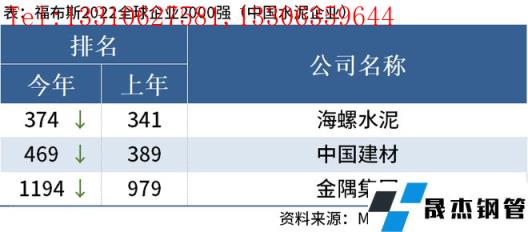 免責(zé)聲明:本網(wǎng)站(山東聊城晟杰無縫鋼管廠www.frdimp.com)刊載的“中國3家水泥企業(yè)上榜福布斯2022全球企業(yè)2000強(qiáng)”等均源于網(wǎng)絡(luò),版權(quán)歸原作者所有,且僅代表原作者觀點(diǎn),本文所載信息僅供參考。轉(zhuǎn)載僅為學(xué)習(xí)與交流之目的,如無意中侵犯您的合法權(quán)益,請及時(shí)聯(lián)系刪除。本網(wǎng)站刊登此篇文章并不意味著本站贊同其觀點(diǎn)或證實(shí)其內(nèi)容的真實(shí)性,我們不對其科學(xué)性、嚴(yán)肅性等作任何形式的保證。如果侵犯了您的版權(quán),請盡快聯(lián)系我們予以撤銷,謝謝合作!
