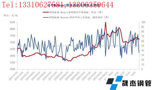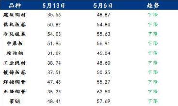 具體各品種指數(shù)來(lái)看,5月13日建筑厚壁無(wú)縫鋼管情緒指數(shù)為35.56,較5月6日回落13.31;熱軋板卷情緒指數(shù)為50.82,較5月6日回落3.98;冷軋板卷情緒指數(shù)為54.03,較5月6日回落1.6;中厚板情緒指數(shù)為51.95,較5月6日回落4.96;結(jié)構(gòu)鋼情緒指數(shù)為31.09,較5月6日回落14.75;工業(yè)線(xiàn)材情緒指數(shù)為38.74,較5月6日回落9.86;鍍鋅板卷情緒指數(shù)為37.51,較5月6日回落12.84;焊接厚壁鋼管情緒指數(shù)為47.48,較5月6日回落7.79;無(wú)縫厚壁鋼管情緒指數(shù)為35.23,較5月6日回落27.27;帶鋼情緒指數(shù)為48.44,較5月6日回落9.25。