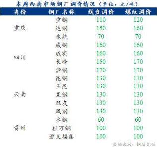 本周四川省部分城市放寬購(gòu)房政策,重慶將迎來(lái)汛期,云南推進(jìn)減產(chǎn)控產(chǎn)進(jìn)度,貴州推進(jìn)過磅改理計(jì); 本周鋼價(jià)持續(xù)弱勢(shì)運(yùn)行,無(wú)縫厚壁鋼管廠家利潤(rùn)明顯收縮,下游需求未有明顯改善,西南無(wú)縫厚壁鋼管廠家?guī)齑嬲w小幅增加。