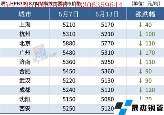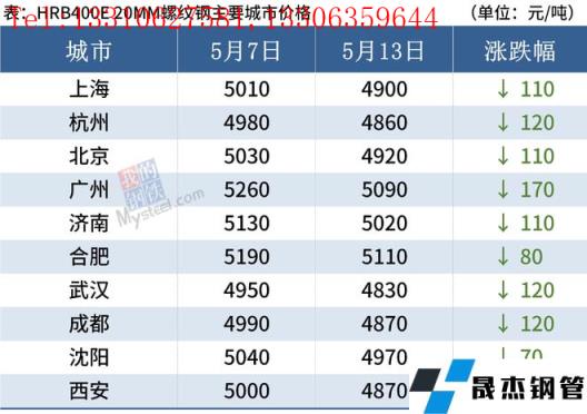 據(jù)監(jiān)測,截至5月13日,全國主要城市20mm三級抗震螺紋鋼均價4956元/噸,較5月7日下跌114元/噸;8.0mmHPB300高線均價5205元/噸,較5月7日下跌101元/噸。