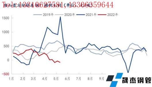 鋼坯盈利情況:本周唐山地區(qū)主流樣本無縫厚壁鋼管廠家平均鐵水不含稅成本為3665元/噸,平均鋼坯含稅成本4721元/噸,周環(huán)比下調(diào)105元/噸,與5月14日普方坯出廠價格4660元/噸相比,無縫厚壁鋼管廠家平均毛利潤-61元/噸,周環(huán)比下調(diào)45元/噸。