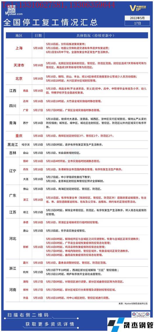 截至5月17日,據(jù)不完全統(tǒng)計(jì),共有15個省份發(fā)布了停工復(fù)工最新信息。5月16日起,上海分階段推進(jìn)復(fù)商復(fù)市。天津多地劃分為封控管控區(qū)。湛江有序恢復(fù)道路旅客運(yùn)輸服務(wù)。四川廣安市廣安區(qū)、達(dá)州市大竹縣全域?qū)嵤┡R時靜態(tài)管理。具體情況如下: