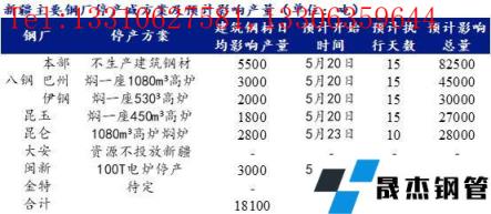 根據初步減限產方案,八鋼本部4座高爐全開,但不生產建筑厚壁無縫鋼管,預計影響建筑厚壁無縫鋼管產量5500噸/日,巴州和伊鋼基地各燜一座高爐,預計影響建筑厚壁無縫鋼管產量分別為3000噸/日和2000噸/日;昆玉燜一座高爐,預計影響建筑厚壁無縫鋼管產量1800噸/噸;昆侖和閩新無縫厚壁鋼管廠家建筑厚壁無縫鋼管停產十天,預計分別影響建筑厚壁無縫鋼管產量2800噸/日和3000噸/日;大安鋼鐵資源暫不投往新疆區(qū)域;金特待定。