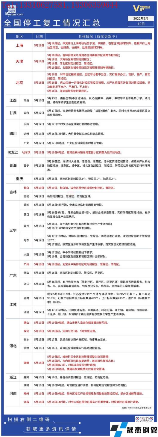 截至5月19日,據(jù)不完全統(tǒng)計(jì),共有16個省份發(fā)布了停工復(fù)工最新信息。北京多地強(qiáng)化封控區(qū)管控區(qū)管理。天津多地調(diào)整為封控區(qū)。上海再恢復(fù)開行8趟列車。唐山轉(zhuǎn)入常態(tài)化精準(zhǔn)管控新階段。具體情況如下: