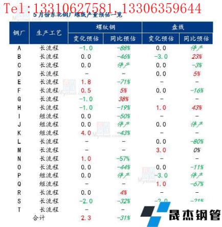 據(jù)4月底的調(diào)研,5月東北無(wú)縫厚壁鋼管廠家螺紋和盤(pán)線的計(jì)劃產(chǎn)量分別為119.5萬(wàn)噸和95.9萬(wàn)噸,同比減少57.1萬(wàn)噸和26.3萬(wàn)噸,環(huán)比增加10.5萬(wàn)噸和12.3萬(wàn)噸;受市場(chǎng)價(jià)格下行影響,無(wú)縫厚壁鋼管廠家虧損幅度擴(kuò)大,部分多品種生產(chǎn)的無(wú)縫厚壁鋼管廠家根據(jù)各品種的虧損幅度和訂單情況進(jìn)行品種間的轉(zhuǎn)產(chǎn),單一生產(chǎn)螺線的無(wú)縫厚壁鋼管廠家部分復(fù)產(chǎn)、部分加大減產(chǎn),具體情況如下:
