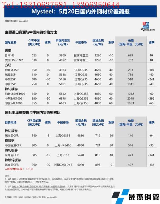 免責聲明:本網(wǎng)站(山東聊城晟杰無縫鋼管廠www.frdimp.com)刊載的“2022年05月20日日報:國內(nèi)外鋼材_無縫鋼管價差匯總(2022.5.20)”等均源于網(wǎng)絡,版權(quán)歸原作者所有,且僅代表原作者觀點,本文所載信息僅供參考。轉(zhuǎn)載僅為學習與交流之目的,如無意中侵犯您的合法權(quán)益,請及時聯(lián)系刪除。本網(wǎng)站刊登此篇文章并不意味著本站贊同其觀點或證實其內(nèi)容的真實性,我們不對其科學性、嚴肅性等作任何形式的保證。如果侵犯了您的版權(quán),請盡快聯(lián)系我們予以撤銷,謝謝合作!