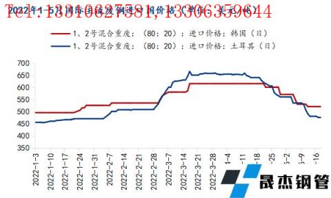 因成品銷售低迷,土耳其無縫厚壁鋼管廠家連續(xù)幾周遠(yuǎn)離深海廢鋼采購,近期開始恢復(fù)采購,據(jù)調(diào)研,截止5月20日,土耳其HMS1:2(80:20)廢鋼到岸價在475美元/噸左右,距離3月份的高點(diǎn)大幅下降190美元/噸,離年內(nèi)低點(diǎn)約21美元/噸。韓國也因海外廢鋼價格的大幅走低,連續(xù)4周未對日本廢鋼進(jìn)行采購,截止5月20日,韓國HMS1:2(80:20)廢鋼到岸價在520美元/噸,距離3月份的高點(diǎn)跌95美元/噸,離年內(nèi)低點(diǎn)約21美元/噸。截止目前,國際主流廢鋼進(jìn)口國廢鋼價格較年內(nèi)峰值大跌近百美元,多接近于年內(nèi)低點(diǎn)。