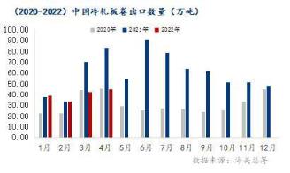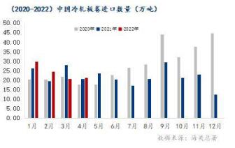海關(guān)總署數(shù)據(jù)顯示:2022年1-4月份我國冷軋板(帶)出口總量共計159.53萬噸,年同比下降40.79%。2022年1-4月份我國冷軋板(帶)進(jìn)口總量共計96.25萬噸,年同比上升1.90%。