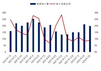(1)進(jìn)口供應(yīng):俄烏沖突下,烏克蘭海運(yùn)出口清零,同時(shí)在中國球團(tuán)進(jìn)口量中,進(jìn)口烏克蘭球團(tuán)比例近兩年均值僅有16%,2021年二季度及2022年1-2月份,進(jìn)口比例更是只有8%-11%。所以雖然烏克蘭海運(yùn)出口被限,但對(duì)于中國國內(nèi)進(jìn)口球團(tuán)總量影響有限,環(huán)比當(dāng)前情況來看很難出現(xiàn)明顯下降趨勢(shì)。