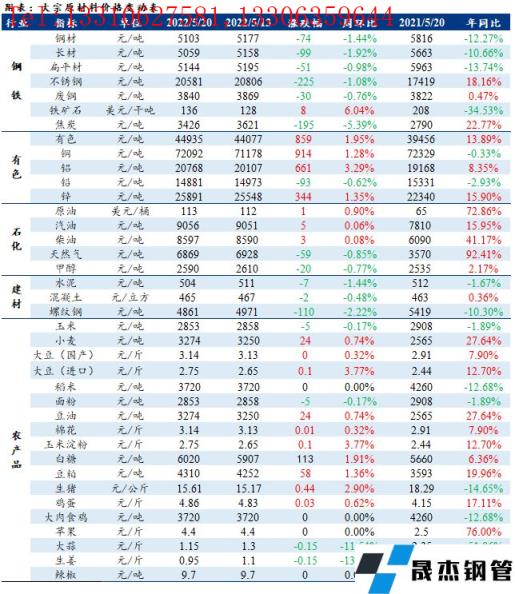 免責(zé)聲明:本網(wǎng)站(山東聊城晟杰無縫鋼管廠www.frdimp.com)刊載的“周報(bào):大宗工業(yè)原材料、能源及農(nóng)產(chǎn)品價格周報(bào)(5.16-5.20)”等均源于網(wǎng)絡(luò),版權(quán)歸原作者所有,且僅代表原作者觀點(diǎn),本文所載信息僅供參考。轉(zhuǎn)載僅為學(xué)習(xí)與交流之目的,如無意中侵犯您的合法權(quán)益,請及時聯(lián)系刪除。本網(wǎng)站刊登此篇文章并不意味著本站贊同其觀點(diǎn)或證實(shí)其內(nèi)容的真實(shí)性,我們不對其科學(xué)性、嚴(yán)肅性等作任何形式的保證。如果侵犯了您的版權(quán),請盡快聯(lián)系我們予以撤銷,謝謝合作!