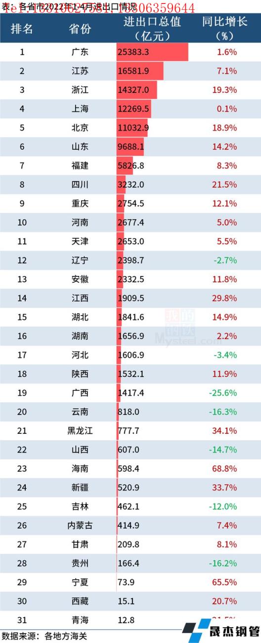 從同比增速來看,24個省市實現(xiàn)同比正增長,海南以68.8%的增速位居全國第一;7個省市實現(xiàn)負增長,廣西以-25.6%的增速位居末位。進出口總值突破萬億元的5個省市中,浙江、北京的增速超出全國水平,同比分別增長19.3%、18.9%。具體如下: