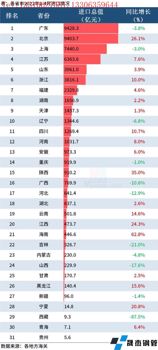 進口方面,今年前4個月,我國進口5.61萬億元,同比增長5%。分省市來看,廣東以9428.3億元的數(shù)值排名第一,同比下降3.8%;廣東、北京、上海、江蘇1-4月進出口均超5千億元。從同比增速來看,共有20個省市實現(xiàn)正增長,其中13個省市增速超出10.3%的平均水平。海南以62.8%的同比增速位居第一,陜西增長35%排名第二,北京增長26.1%排名第三。此外,共有11個省市進口同比實現(xiàn)負增長,分別是重慶、新疆、上海、廣東、內(nèi)蒙古、遼寧、廣西、河北、山西、吉林和西藏,西藏以-87.5%的增速位居末尾。