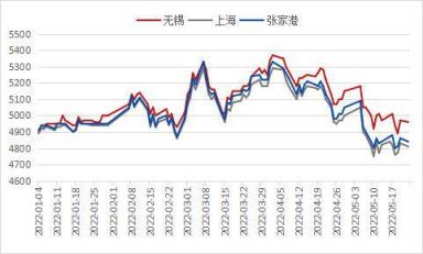從年初開始,本地市場價格是處于4900元/噸的水平,對比歷年來講這個價格算是偏高的,到2月10號之前基本上處于小幅平穩(wěn)上漲的態(tài)勢,出現了一個小極值在5150元/噸,第二個高點出現在3月8號左右,價格處于5350元/噸左右,此時周邊市場開始受到疫情管控的影響,資源運輸不暢,倉庫提貨困難,市場價格開始大幅下行,到三月中旬總共下跌了300元/噸,下半月市場需求情況受傳統旺季提振有一定恢復,到3月底四月初達到了第三個高點5370元/噸的水平,也是目前為止的最高點,和去年上半年高點相比大幅下降。從4月初一直到現在,中間雖然有階段性反彈,但是價格趨勢整體呈現震蕩下跌的態(tài)勢,目前處于4890元/噸的水平,基本上平了2022年年初的水平。