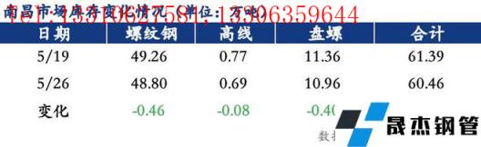 分品種來看,以南昌市場為例,本周南昌市場建筑厚壁無縫鋼管總庫存為60.46萬噸,其中螺紋鋼庫存為48.80萬噸,周環(huán)比減少0.46萬噸,降幅為0.93%;高線庫存為0.69萬噸,周環(huán)比減少0.08萬噸,降幅為10.39%;盤螺庫存為10.96萬噸,周環(huán)比減少0.40噸,降幅為3.52%。從資源占比來看,螺紋鋼資源占比80.72%,線盤資源占比19.28%,螺紋鋼占比較上周變化不大。