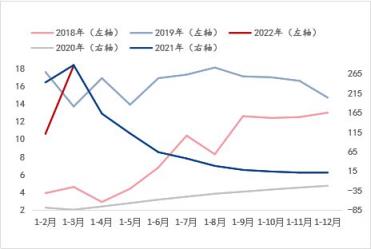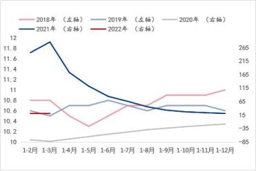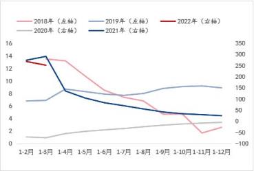 從基礎(chǔ)設(shè)施投資增速和房地產(chǎn)開發(fā)投資增速來看(涉及到對(duì)應(yīng)年份走勢使用左右軸的區(qū)分目的與固定資產(chǎn)投資增速指標(biāo)的說明一致),兩個(gè)指標(biāo)在2020年-2021年非正常環(huán)境條件下的年份增速趨勢基本一致,但在正常環(huán)境條件下的年份增速可以看到,伴隨湖北省每年所需完成的經(jīng)濟(jì)增長目標(biāo)的大背景下,此兩項(xiàng)指標(biāo)的增速表現(xiàn)呈現(xiàn)此消彼長的走勢。而結(jié)合斜率來看,進(jìn)入2022年1-3月,基礎(chǔ)設(shè)施投資增速呈現(xiàn)明顯快速恢復(fù)或釋放態(tài)勢,而房地產(chǎn)開發(fā)投資增速則呈現(xiàn)明顯放緩態(tài)勢。由此看來,對(duì)于建筑厚壁無縫鋼管品種的需求將在房地產(chǎn)板塊的萎縮預(yù)期更為明顯,這與目前所處的房地產(chǎn)調(diào)控政策背景是相符的,即便有所改善,筆者認(rèn)為仍暫難有實(shí)質(zhì)上的新刺激,而基礎(chǔ)設(shè)施投資或?qū)⑹峭械椎闹我蛩刂弧>C合來看,湖北省宏觀指標(biāo)數(shù)據(jù)的預(yù)期演變表明對(duì)于建筑厚壁無縫鋼管品種的需求預(yù)期呈現(xiàn)萎縮態(tài)勢,這與產(chǎn)能角度的供應(yīng)增加形成供需矛盾加劇的預(yù)期,因此這是導(dǎo)致建筑厚壁無縫鋼管價(jià)格偏低運(yùn)行的外因之一。
