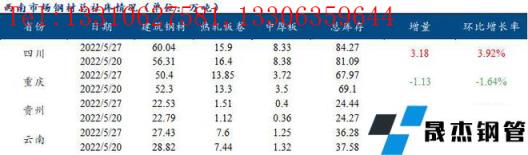 據(jù)調(diào)研,截止2022年5月27日,西南市場厚壁無縫鋼管累計社會庫存為212.96萬噸,環(huán)比增加0.92萬噸,漲幅0.43%。分省份來看,本周四川市場厚壁無縫鋼管庫存為84.27萬噸,環(huán)比增加3.18萬噸,漲幅3.92%;重慶市場厚壁無縫鋼管庫存為67.97萬噸,環(huán)比減少1.13萬噸,降幅1.64%;貴州市場厚壁無縫鋼管庫存為24.44萬噸,環(huán)比增加0.17萬噸,漲幅0.70%;云南市場厚壁無縫鋼管庫存為36.28萬噸,環(huán)比減少1.3萬噸,降幅3.46%。