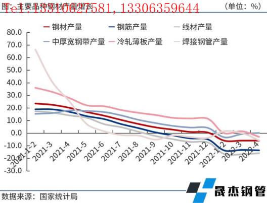 按厚壁無縫鋼管品種來看,2022年1-4月份,我國(guó)厚壁無縫鋼管產(chǎn)量4.27億噸,同比下降5.9%。其中,鋼筋產(chǎn)量7582.8萬噸,同比下降13.6%;線材產(chǎn)量4521.4萬噸,同比下降15.9%;冷軋薄板產(chǎn)量1383.3萬噸,同比下降2.9%;中厚寬鋼帶產(chǎn)量6141.9萬噸,同比增長(zhǎng)0.2%;焊接厚壁鋼管產(chǎn)量1692.1萬噸,同比下降5.7%。