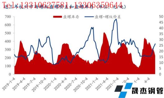 2022年初起受需求偏弱,庫存持續(xù)居高不下影響,浙江市場主流無縫厚壁鋼管廠家盤螺螺紋價差基本穩(wěn)定在200元/噸附近水平。而4月下旬以來,主流無縫厚壁鋼管廠家盤螺與螺紋價差逐步擴大,到5月下旬有進一步擴大的趨勢。截止5月27日,以杭州市場為例,中天HRB40016-25mm螺紋鋼4700元/噸,中天HRB4008-10mm盤螺5080元/噸,盤螺價格高于螺紋鋼380元/噸,由此浙江市場盤螺價格再次成為全國相對高位。近期浙江各市場盤螺庫存加速去化,主流無縫厚壁鋼管廠家盤螺與螺紋價差走勢有進一步擴大的趨勢。筆者調(diào)研了解到主要有以下幾點原因,給大家做個簡要分析: