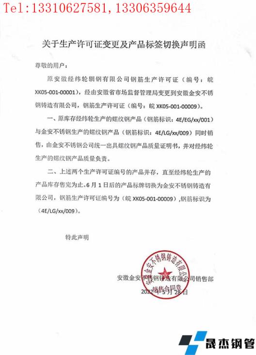 二、上述兩個生產(chǎn)許可證編號的產(chǎn)品并存,直至經(jīng)緯輪生產(chǎn)的產(chǎn)品庫存售完為止。6月1日后的產(chǎn)品標牌切換為金安不銹鋼鑄造有限公司,鋼筋生產(chǎn)許可證編號為(皖XK05-001-00009),鋼筋標識為(4E/LG/xx/009)。