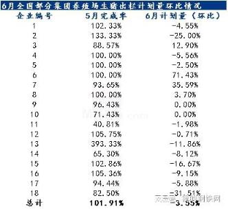 據農產品調研了解,針對18家集團養(yǎng)殖場全國生豬出欄情況來看,5月生豬出欄完成率總計101.91%,6月出欄量較5月實際出欄量環(huán)比下跌3.55%。