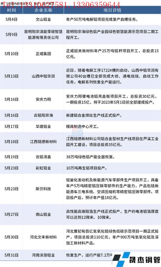 免責聲明:本網站(山東聊城晟杰無縫鋼管廠www.frdimp.com)刊載的“5月國內14個鋁項目開工、投產或復產”等均源于網絡,版權歸原作者所有,且僅代表原作者觀點,本文所載信息僅供參考。轉載僅為學習與交流之目的,如無意中侵犯您的合法權益,請及時聯系刪除。本網站刊登此篇文章并不意味著本站贊同其觀點或證實其內容的真實性,我們不對其科學性、嚴肅性等作任何形式的保證。如果侵犯了您的版權,請盡快聯系我們予以撤銷,謝謝合作!