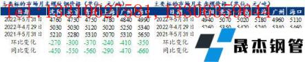 截至5月31日,東北地區(qū)建筑厚壁無縫鋼管主要流向市場中螺紋鋼價格???990元/噸最高、環(huán)比上月末跌350元/噸,北京4730元/噸最低、環(huán)比上月末跌300元/噸;盤螺???110元/噸最高、環(huán)比上月末跌350元/噸,沈陽4940元/噸最低、環(huán)比上月末跌320元/噸。