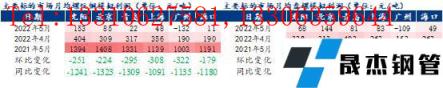 從跌幅來看,2022年5月份主要流向市場中螺紋鋼環(huán)比跌幅最大的是廣州410元/噸、最小的是上海240元/噸,同比跌幅最大的是海口660元/噸、上海290元/噸;盤螺環(huán)比跌幅最大的是廣州380元/噸、最小的是上海60元/噸,同比跌幅最大的是???00元/噸、最小的是沈陽及北京300元/噸。