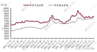 從華東江里汽柴油船單價格來看:6月初汽油均值為8925元/噸,環(huán)比上月8713元/噸的均值,上漲213元/噸,漲幅2.44%。而柴油6月初均值為8525元/噸,環(huán)比上月8339元/噸的均值,上漲186元/噸,漲幅2.23%。見上圖1。
