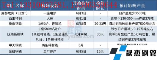 據(jù)不完全統(tǒng)計(jì),截至6月7日,國(guó)內(nèi)6家無(wú)縫厚壁鋼管廠家發(fā)布檢修計(jì)劃。其中,撫順新鋼鐵計(jì)劃6月中旬起對(duì)廠內(nèi)1座580m3高爐進(jìn)行30天左右的年修,預(yù)計(jì)鐵水日產(chǎn)量減少0.15萬(wàn)噸左右、共影響鐵水產(chǎn)量4.5萬(wàn)噸左右;同時(shí)1條線材軋線、1條全連軋軋線、1條棒材輪修,預(yù)計(jì)影響6月盤線產(chǎn)量5萬(wàn)噸左右、螺紋鋼產(chǎn)量3萬(wàn)噸左右。