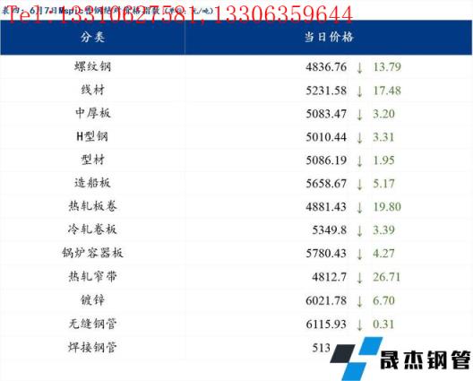 6月7日普鋼絕對(duì)價(jià)格指數(shù)變化:綜合指數(shù)5067.23,下跌13.43;螺紋鋼指數(shù)4836.76,下跌13.79;線(xiàn)材指數(shù)5231.58,下跌17.48;熱軋板卷指數(shù)4881.43,下跌19.8;冷軋板卷指數(shù)5349.8,下跌3.39;中厚板指數(shù)5083.47,下跌3.2。